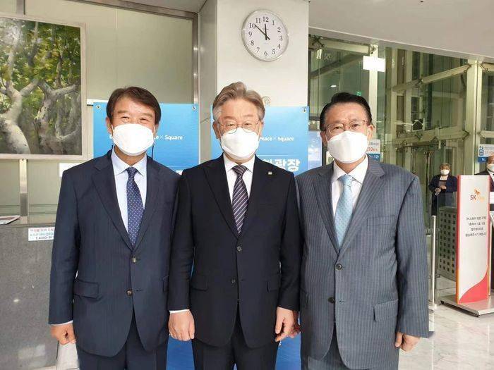 2021年5月,李在明(中)和权起植(右)等在首尔合影。图/受访者提供