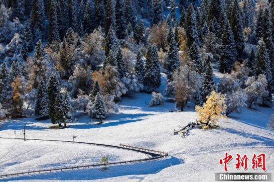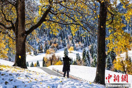 金秋与飞雪,是一场与众不同的秋日之旅。近日,一场秋雪与新疆那拉提大草原上的五彩金秋相遇。图为秋冬交接季,色彩斑斓时。张文庭 摄