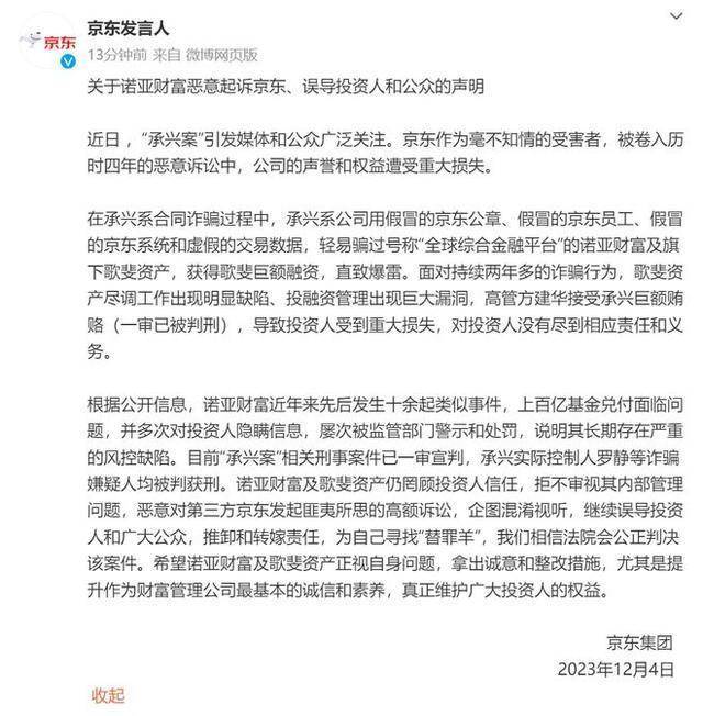 2023年12月4日,京东集团正式发布声明称,诺亚财富恶意起诉京东、误导投资人和公众,推卸和转嫁责任,为自己寻找“替罪羊”。