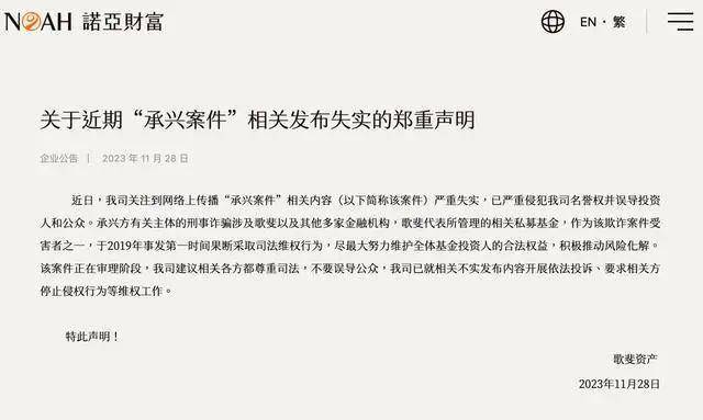 稍早前,诺亚财富发布声明表示,网络上传播“承兴案件”严重失实,已严重侵犯到公司名誉权并误导投资人和公众。承兴方有关主体的刑事诈骗涉及歌斐以及其他多家金融机构,歌斐代表所管理的相关私募基金,作为欺诈案件受害者之一,于2019年事发第一时间果断采取司法维权行为,尽最大努力维护全体基金投资者的合法权益,积极推动风险化解。