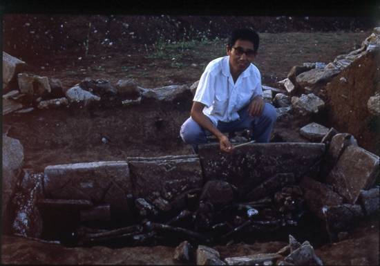 1984年8月,牛河梁遗址第二地点四号墓出土玉龙,郭大顺在现场。