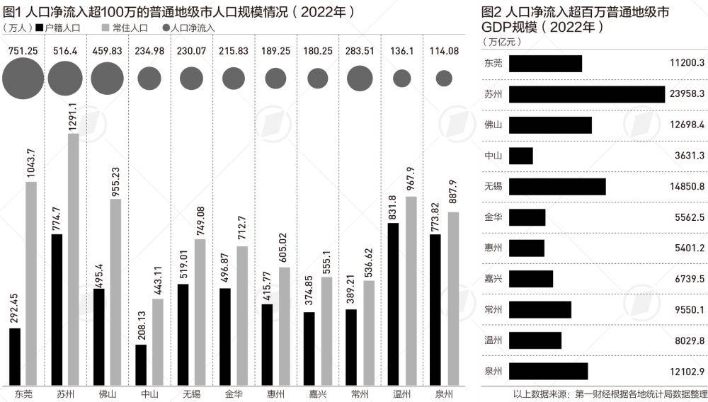 第一财经记者根据各地统计公报、公开数据梳理发现,我国有11个普通地级市的人口净流入超过100万,其中有6个地级市人口净流入超过200万人,东莞、苏州和佛山位居前三。