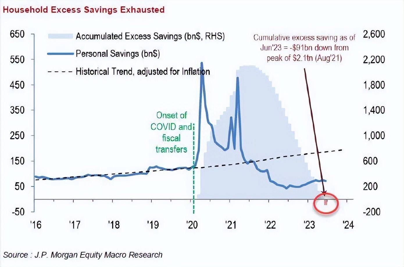 上月摩根大通的CEO戴蒙预计,美国家庭将在大概今年底以前耗尽他们在疫情期间的这些过剩储蓄。那将为消费者支出下滑和经济放缓奠定基础。