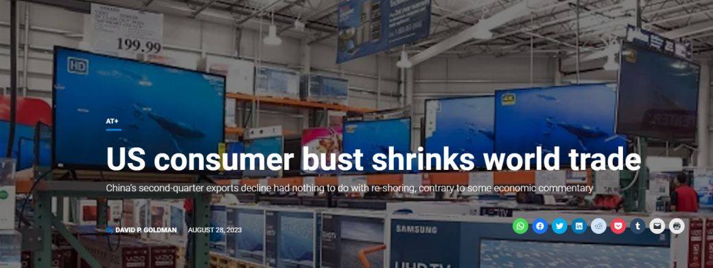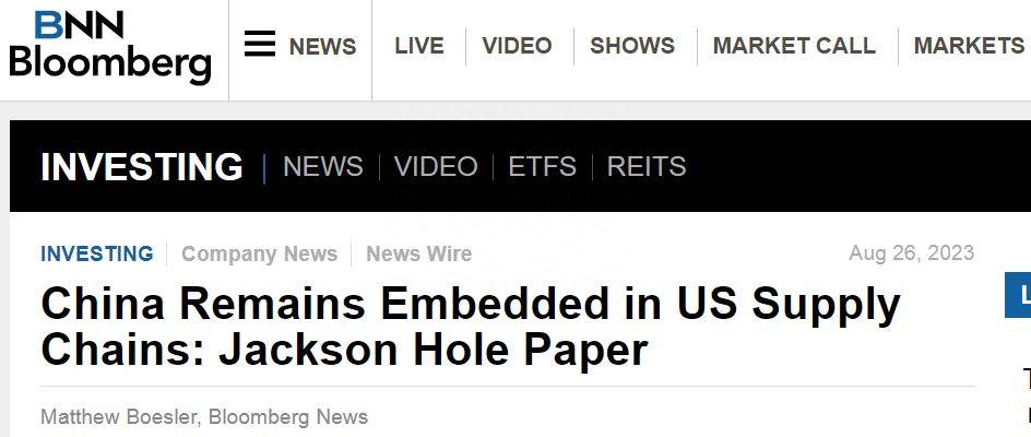 先是美国学者在堪萨斯城联储主办的杰克逊霍尔研讨会上发布了长篇大报告《全球供应链:迫在眉睫的“重新分配”》,然后是彭博社《中国仍嵌入美国供应链》,又有亚洲时报《美国消费萧条导致世界贸易萎缩》,紧接着今天(8月31日)纽时都跑出来刊发了一篇《“脱钩”不易:研究发现美国供应链仍高度依赖中国》。
