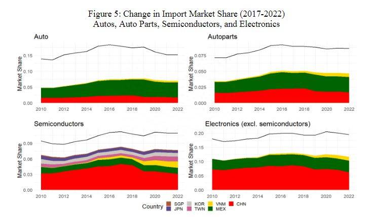 中国在美国商品进口中所占的比例在2017年达到22%的峰值后,到2022年降至约17%,主要是因为中国产品在美国进口的机械设备、鞋子、电话机等产品类别中的占比降低。