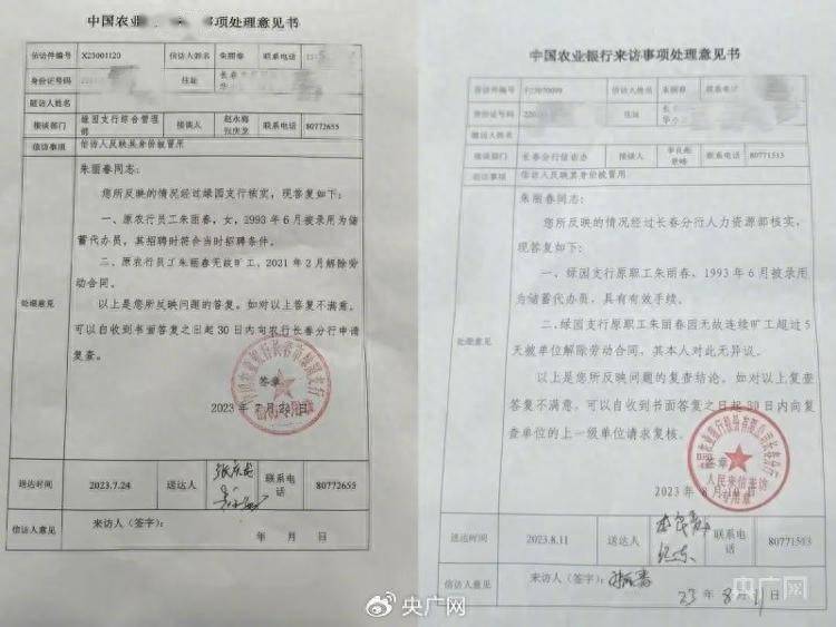 7月24日,朱丽春接到了中国农业银行长春市绿园支行的《中国农业银行来访事项处理意见书》(以下简称《处理意见书》),上面写道:原农行员工朱丽春,女,1993年6月被录用为储蓄代办员,其招聘时符合当时招聘条件。原农行员工朱丽春无故旷工,2021年2月解除劳动合同。
