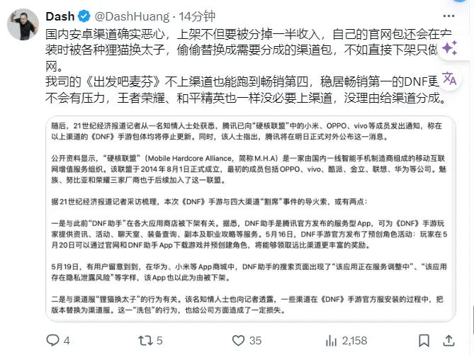 值得注意的一点,2020年年底,恰恰是安卓渠道与游戏厂商第一次大规模的爆发有关分成协议的时间点,当时米哈游的《原神》上线后决定不上架安卓渠道,将安卓渠道与游戏厂商间的矛盾第一次大范围的曝光在公众前。